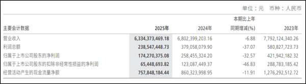 翻看太平鸟2025年年报,一组组下滑的数据,勾勒出这家老牌时尚企业全年的经营困局。公司全年实现营业收入63.34亿元,同比下降6.88%;归母净利润1.74亿元,同比大幅下降32.57%;扣非归母净利润仅6544.87万元,同比骤降46.83%。