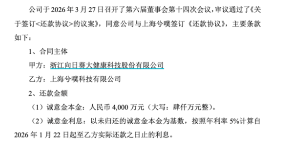 根据公告,公司于今年1月14日披露了《关于终止发行股份及支付现金购买资产并募集配套资金暨关联交易事项的公告》。根据协议约定:如本次交易终止,上海兮噗应在交易终止后5个工作日内将意向金退还。公司已于2026年1月15日向上海兮噗发送了《催收函》,要求其履行退款义务。向日葵方面表示,经双方友好协商,同意共同探讨分期返还或其他可行的还款安排。