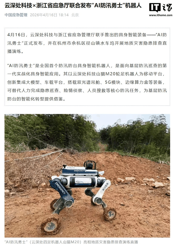 IT之家 4 月 16 日消息,据“中国应急管理”公众号今日分享,云深处科技与浙江省应急管理厅联手推出的具身智能装备 ——“AI 防汛勇士”正式发布,并在杭州市余杭区径山镇水车坞开展地质灾害隐患排查直播演练。
