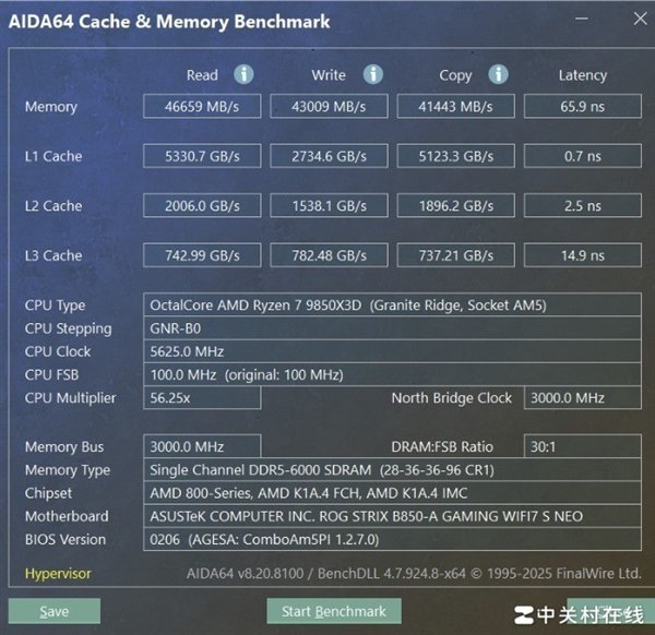 我们这里也给大家实测了,单根16GB DDR5 6000内存和双16GB DDR5 6000内存之间的内存差异,大家可以参考一下。首先是基准性能,我们来看一下双16GB DDR5 6000内存的跑分。
