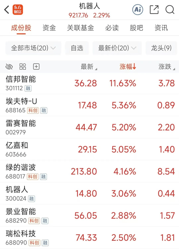除了电子半导体等题材强势外, 机器人 板块也在4月27日走强,板块中 信邦智能 、埃夫特、 雷赛智能 、 亿嘉和 、 绿的谐波 涨幅靠前。