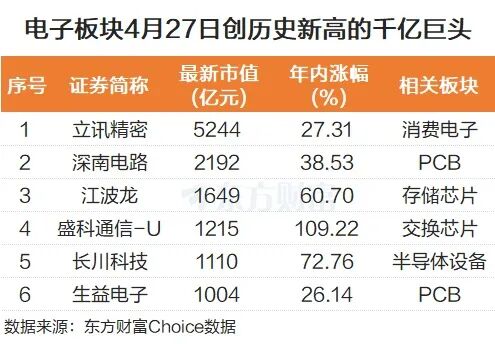 立讯精密 ( 消费电子 )、 深南电路 ( PCB )、 江波龙 ( 存储芯片 )、盛科 通信 (交换芯片)、 长川科技 ( 半导体设备 )、 生益电子 ( PCB )这6只千亿龙头再创 历史新高 。