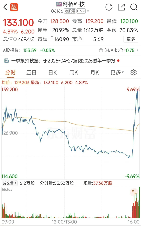 此外, 剑桥科技 H股尾盘的大幅拉升,也成为了市场讨论的焦点。具体而言, 剑桥科技 H股在今天尾盘从跌5.04%,快速拉升至涨9%以上,短时拉升幅度超过14%。收盘时, 剑桥科技 H股涨幅为4.89%。