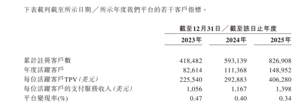数据显示,平台处理的TPV从2023年的186亿美元提升至2025年的605亿美元,年复合增长率达80.2%,带动同期收入从1.15亿美元增长至2.49亿美元,年复合增长率为47.1%。2023年至2025年,公司保持了超过90%的高毛利率水平。与此同时,公司经营利润从2023年的650万美元增长至2025年的4410万美元,年复合增长率为161.4%。