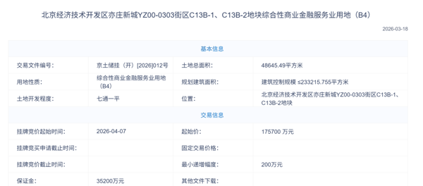 该地块总用地面积约4.87万平方米,成交时间为2026年4月21日,地块紧邻 京东 亦庄总部。该地块的位置范围为东至经海四路,南至科创十二街,西至经海三路,北至科创十一街。据财联社,此次交易的竞得方实际为 京东 集团。