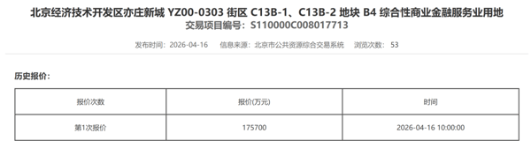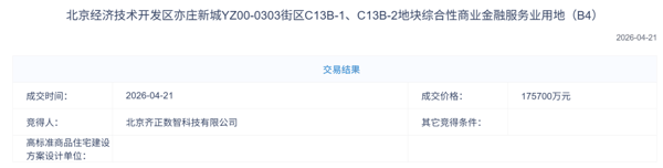 据北京市规划和自然资源委员会官网公示信息,北京齐正数智科技有限公司以17.57亿元的价格,获得北京经济技术开发区亦庄新城YZ00-0303 街区C13B-1、C13B-2地块 综合 性商业金融服务业用地(B4)。