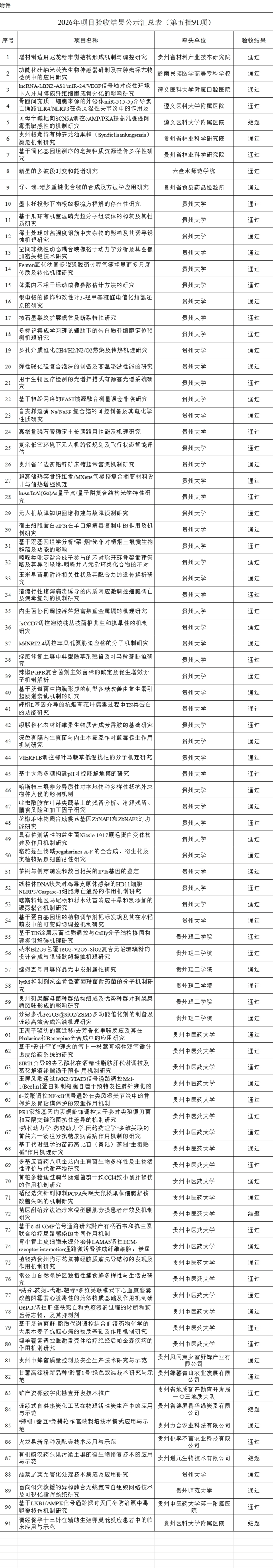 按照《贵州省省级科技计划项目验收规则(试行)》(黔科通〔2023〕3号)规定,现对91项项目验收结果进行公示,公示时间为5个工作日(2026年4月27日-5月6日)。