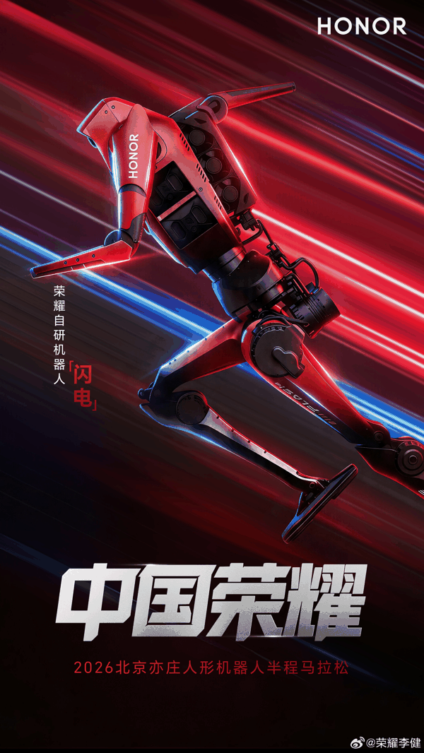 IT之家 4 月 19 日消息,今日 7:30,由北京市人民政府、中央广播电视总台等联合主办的 2026 人形机器人半程马拉松在北京亦庄正式开跑。来自北京荣耀的绝影赤兔队率先开跑,该战队的参赛机器人为“闪电”。