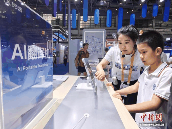 4月16日,消费者在科大讯飞展台体验AI翻译机。中新网记者王子谦摄