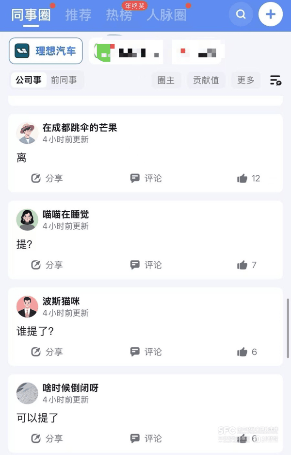 (发年终奖当天,理想汽车社交媒体同事圈截图)