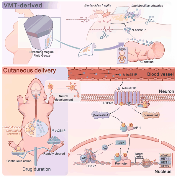 机制研究显示, N -bc2S1P并非单一菌种产生,而是由两种共生菌协同生成:卷曲乳杆菌提供β-咔啉,脆弱拟杆菌提供鞘氨醇-1-磷酸,在新生儿皮肤微环境中共同合成该分子。生成的 N -bc2S1P可经皮进入体循环并到达脑组织,作用于前脑兴奋性神经元上的S1PR2受体,选择性激活β-arrestin1偏向的信号通路,进而促进AP-1/CBP复合体募集,增强Notch相关基因位点的H3K27乙酰化水平,从表观遗传层面改善剖宫产相关的早期神经发育异常。