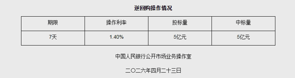 4月23日央行开展5亿元7天期逆回购操作