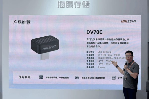 在媒体采访环节,海康存储产品总监冯广欣系统阐述了公司在车载存储领域的核心竞争优势。首先是稳定而成熟的项目经验。自2024年推出第一代车规级U盘以来,该产品已为多家头部新能源车企稳定供货超过两年。通过与主机厂的联合开发,实现了从底层固件到系统层面的深度适配。其次是本地化的技术团队支持,能够快速响应客户在产品定制、系统集成及售后维护中的各类需求。