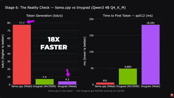 他在视频中强调,RTX 5090 并没有在 macOS 中跑出全部性能。主要是因为驱动当前依赖 Tiny Grad 编译器, 未使用 Metal / CUDA 原生优化 ,性能相比 Metal 原生方案慢了 10 倍。不过 Blackwell 架构的优势也有体现,其首 Token 响应速度相比 Metal 方案快 3-4 倍。