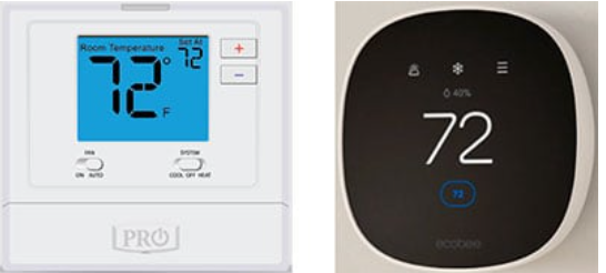 图2:经典开关闭合环路无法为基础数字恒温器(左)或连接物联网版本(右)供电,引发了如何为这些负载供电的问题。(图片来源:PRO1iaq,Ecobee)