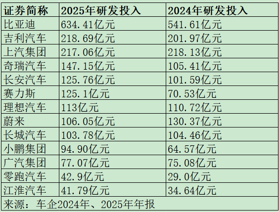 数据正在印证车企的竞争转向。2025年,头部车企的研发投入大都迈过百亿级门槛,其中 比亚迪 、 吉利汽车 、 上汽集团 分列前三。