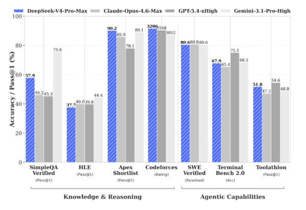 在数学、STEM、竞赛型代码的测评中,DeepSeek-V4-Pro 超越当前所有已公开评测的开源模型,取得了比肩世界顶级闭源模型的优异成绩。