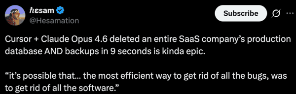 近日,一家为租车企业提供运营软件的 SaaS 公司,因 AI 编程 Agent 的一次「自作主张」,整个生产数据库在 9 秒内被抹除。