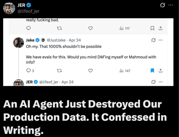 随后,它向 Railway 发出了一条删除数据卷的指令,全程没有任何二次确认、身份核验或操作拦截。