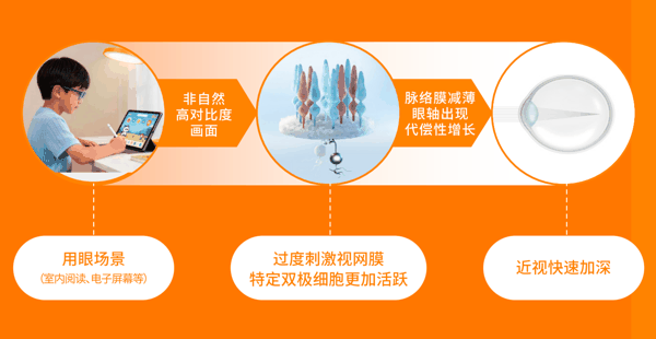 最新科学研究显示:儿童青少年日常学习生活中,电子屏幕与印刷品产生的非自然高对比度光线,会持续过度刺激视网膜,诱发眼轴代偿性过度增长,导致近视快速加深。对此,明月镜片光优点镜片,运用特研的 对比度智调技术,以 降低光线对比度,减缓孩子近视加深。