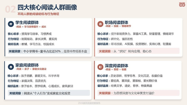 报告通过大数据分析,明确四大阅读核心人群,各人群需求呈现鲜明差异化特征: