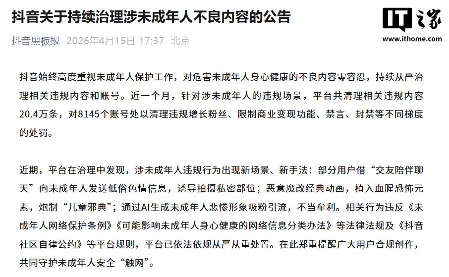 IT之家 4 月 15 日消息,“抖音黑板报”公众号今天下午发布公告称,近一个月,针对涉未成年人的违规场景, 平台共清理相关违规内容 20.4 万条 ,对 8145 个账号处以清理违规增长粉丝、限制商业变现功能、禁言、封禁等不同梯度的处罚。