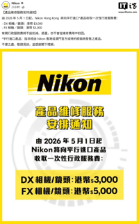 尼康香港将对平行进口产品维修服务征收行政费用,最高5000港元2026年04月28日17:57IT之家IT之家4月28日消息,尼康香港宣布,自2026年5月1日起,将对平行进口产品维修服务征收一次性行政服务费。