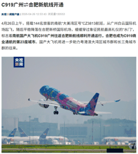 南航国产大飞机C919广州往返合肥新航线开通2026年04月26日13:22IT之家IT之家4月26日消息,据央视新闻报道,4月26日上午,搭载144名旅客的南航“大美湾区号”CZ3813航班,从广州白云国际机场起飞,随后平稳降落在合肥新桥国际机场,缓缓穿过象征民航最高礼仪的“水门”,标志着南航国产大飞机C919广州往返合肥新航线顺利开通运行,合肥也成为C919商业通航的第23座城市。